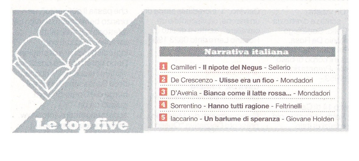 Il primo romanzo “Un barlume di speranza” (Giovane Holden Edizioni, 2008) arriva alla II Edizione nel 2010 e in classifica su La Repubblica Ed. Napoli al 5° posto tra i libri di Narrativa Italiana più venduti in una nota libreria campana.